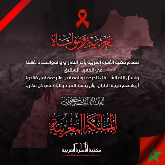 تعازينا الحارة لأهلنا في المغرب نسأل الله لهم السلامة والأمن والأمان. وأن يعجل بشفاء الجرحى والمصابين، وأن يرحم الذين وافاهم الأجل، وأن يلهم أهلهم الصبر والرضا.