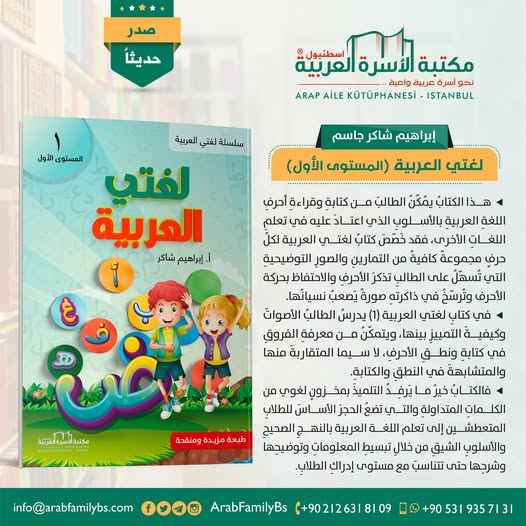 ◂ هذا الكتابُ يُمكّنُ الطالبَ من كتابةِ وقراءةِ أحرفِ اللغةِ العربيةِ بالأسلوبِ الذي اعتادَ عليه في تعلمِ اللغاتِ الأخرى، فقد خَصّصَ كتابُ لغتي العربية لكلِّ حرفٍ مجموعةً كافيةً من التمارينِ والصورِ التوضيحيةِ التي تُسهّلُ على الطالبِ تذكرَ الأحرفِ والاحتفاظ بحركة الأحرف وتُرسّخُ في ذاكرتهِ صورةً يَصعبُ نسيانُها.