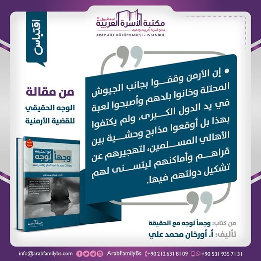 جديدنا من إصدارات #مكتبة_الأسرة_العربية 😁 #وجها_لوجه_مع_الحقيقه اقتباس من كتاب إن الأرمن وقفوا بجانب الجيوش المحتلة وخانوا بلدهم وأصبحوا لعبة في يد الدول الكبرى، ولم يكتفوا بهذا بل أوقعوا مذابح وحشية بين الأهالي المسلمين، لتهجيرهم عن قراهم وأماكنهم ليتسنى لهم تشكيل دولتهم فيها. من مقالة الوجه الحقيقي للقضية الأرمنية كتاب وجهاً لوجه مع الحقيقة. المؤلف: أ. […]