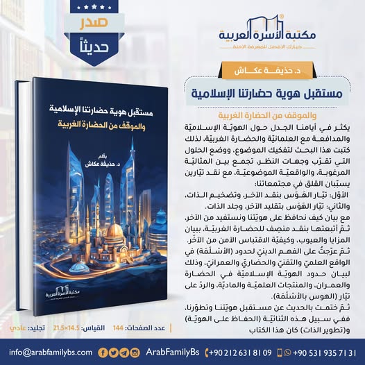 صدر حديثاً📚 #مكتبة_الأسرة_العربية كتاب #مستقبل_هوية_حضارتنا_الإسلامية والموقف من الحضارة الغربية المؤلف #حذيفة_عكاش 🖋هذا الكتاب: يكثر في أيامنا الجدل حول الهويّة الإسلاميّة والمدافعة مع العلمانيّة والحضارة الغربيّة، لذلك كتبت هذا البحث لتفكيك الموضوع، ووضع الحلول التي تقرّب وجهات النظر، تجمع بين المثاليّة المرغوبة، والواقعيّة الموضوعيّة، مع نقد تيّارين يسبّبان القلق في مجتمعاتنا: الأوّل: تيّار الهَوَس بنقد الآخر، […]