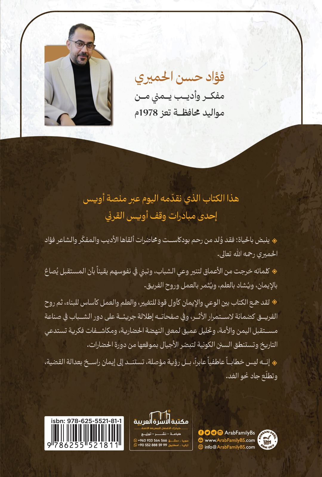 لقد جمع الكتاب بين الوعي والإيمان كأول قوة للتغيير، والعلم والعمل كأساس للبناء، ثم روح الفريق كضمانة لاستمرار الأثر، وفي صفحاته إطلالة جريئة على دور الشباب في صناعة مستقبل اليمن والأمة، وتحليل عميق لمعنى النهضة الحضارية، ومكاشفات فكرية تستدعي التاريخ وتستنطق السنن الكونية لتبصّر الأجيال بموقعها من دورة الحضارات.